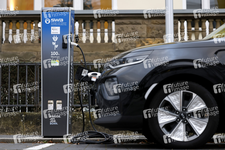 Ein Elektroauto lädt an einer Stromtankstelle von SWB 100 Prozent sauberen Ökostrom. (Themenbild, Symbolbild) Bonn, 10.02.2022