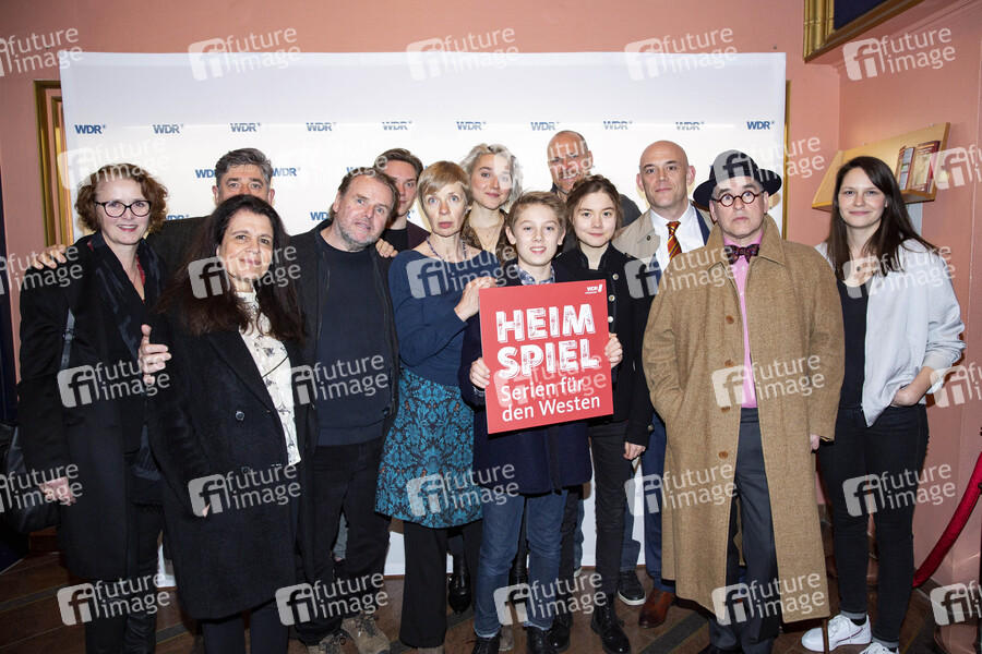Elke Kimmlinger, Christina Voss-Michalke, Johannes Rotter, Felix Vörtler, Alvar Julian Goetze, Anna Stieblich, Antonia Lingemann, Moritz Klaus, Markus Hoffmann, Hannah Schiller, Robert Dölle, Ulrich Lask und Katarina Cvitic bei der Präsentation des neuen Primetime-Sendeplatzes 'Heimspiel - Serien für den Westen' mit den Previews der TV-Serien 'Ohne Schnitzel geht es nicht', 'Phoenixsee' und 'Meuchelbeck' im Lichtspiel- und Kunsttheater Schauburg. Dortmund, 26.03.2019
