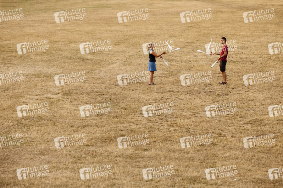 Jongleure auf einer verdorrten Wiese im Rheinpark. Köln, 25.07.2019