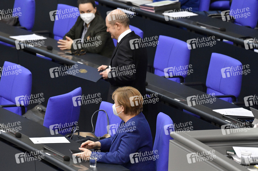 Olaf Scholz und Angela Merkel in der 212. Sitzung des Deutschen Bundestages im Reichstagsgebäude. Berlin, 25.02.2021
