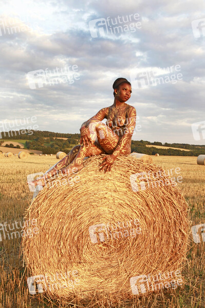 Bodypainting, Erotik, Frau, Mädchen, Afrikanerien, nackt, draußen, weiblich, Körperkunst, Kunst, Ornamente, Malerei, Feld, Acker, Stoppelfeld, Heuballen, Stroh, Landwirtschaft, Ernte, Abendsonne, erotic, African woman, girl, nude, outdoor, female, body art, body painting, ornaments, field, hay, straw, farming, harvest, evening sun