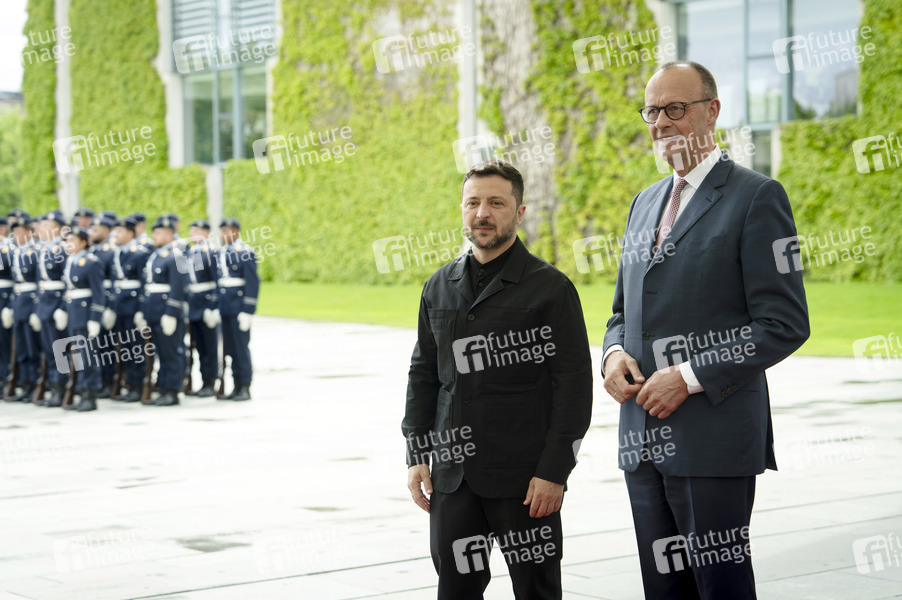 Wolodymyr Selenskyj und Friedrich Merz beim Empfang des Präsidenten der Ukraine mit militärischen Ehren und zu einem gemeinsamen Gespräch mit dem Bundeskanzler mit anschließendem Pressestatement im Bundeskanzleramt. Berlin, 28.05.2025