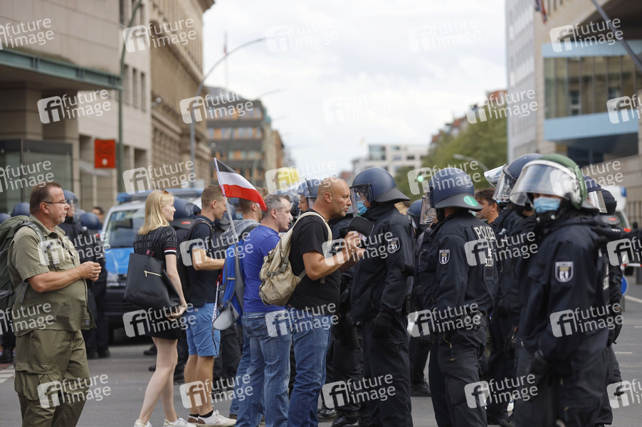 Im Bild die Demo vor der russischen Botschaft. Demonstranten verschiedener Gruppierungen wie etwa der Initiative Querdenken 711 protestierten mit einer Großdemonstration in Berlin gegen die bestehenden Maßnahmen zur Eindämmung der Corona-Pandemie. Wegen Nichteinhaltung der polizeilichen Auflagen wurde die Demonstration durch die Polizei beendet. Es gab Rangeleien und Festnahmen. Berlin, 29.08.2020
