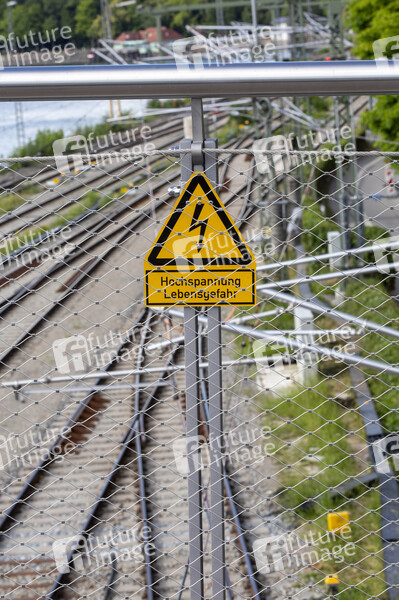 Neubau Oberleitungsträgerwerke mit Warhnhinweis 'Hochspannung - Lebensgefahr' an der Ausbaustrecke der neu elektrifizierten Südbahn im Teilabschnitt von Friedrichshafen nach Lindau. Lindau, 01.07.2020