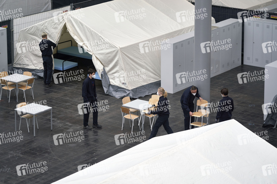 Zeltdörfer-Unterkünfte für ukrainische Kriegsflüchtlinge in der Halle 27 auf dem Messegelände, inklusive Wasch- und Duschmöglichkeiten, errichtet von der Feuerwehr Hannover. Die spätere Versorgung erfolgt durch das DRK. Hannover, 06.03.2022