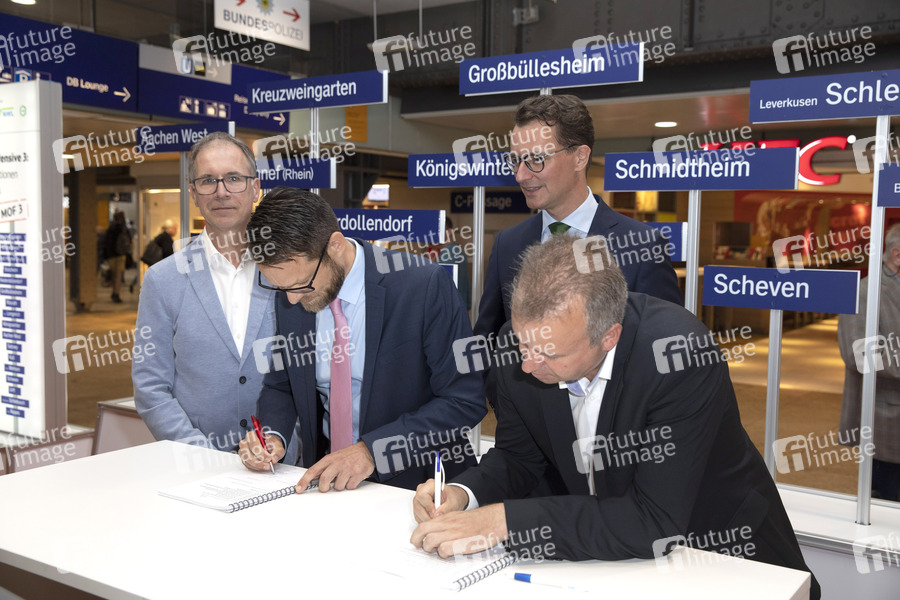 Bahn-Funktionäre, Politiker, CDU, Verkehrsminister von Nordrhein-Westfalen, Nahverkehr Rheinland, NVR, Modernisierungsoffensive 3, MOF 3, C-Passage, Unterzeichnung, Finanzierungsvereinbarung, Haltepunkte, Deutsche Bahn, DB, Bahnhöfe, Modernisierung, Bahnsteige, Stationen, Aufenthaltsqualität, Reisende