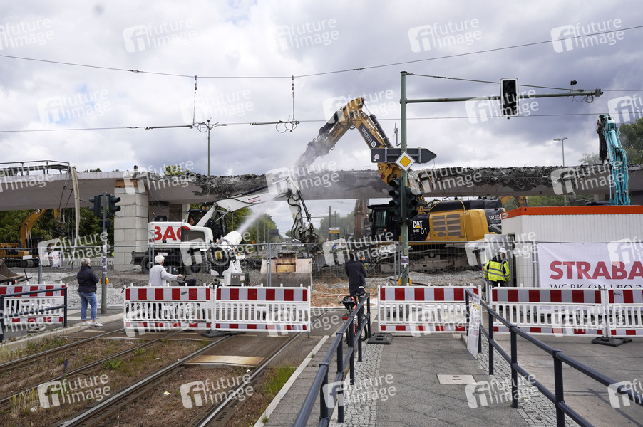Der Abriss der maroden Brücke an der Wuhlheide (Oberschöneweide) geht zügig voran. Bereits am 2. Tag wird schon ein Teil der Brücke abgerissen. Die kaputte Brücke soll schnellstmöglich entfernt werden mit dem Ziel, die Freigabe der blockieren Straßenbahntrasse und Wiederherstellung des Fuß- und Radverkehrs zwischen Treskowallee und Edisonstraße möglichst bis zum 30. Mai. Berlin, 24.05.2025