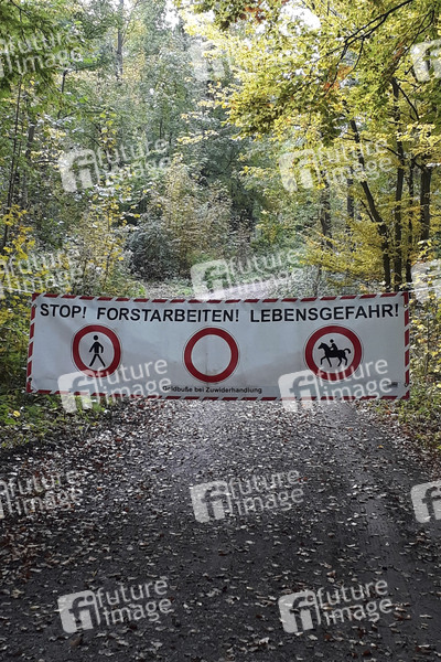 Waldsterben, Baumschäden, Forstarbeiten, Absperrung, Waldweg, Wald, Forst, Natur, Herbst, Herbstlaub, Waldarbeiten, Holz, Gefahr, Gefahrenhinweis, Warnung, Durchgang verboten, Symbolfoto, Symbolbild
