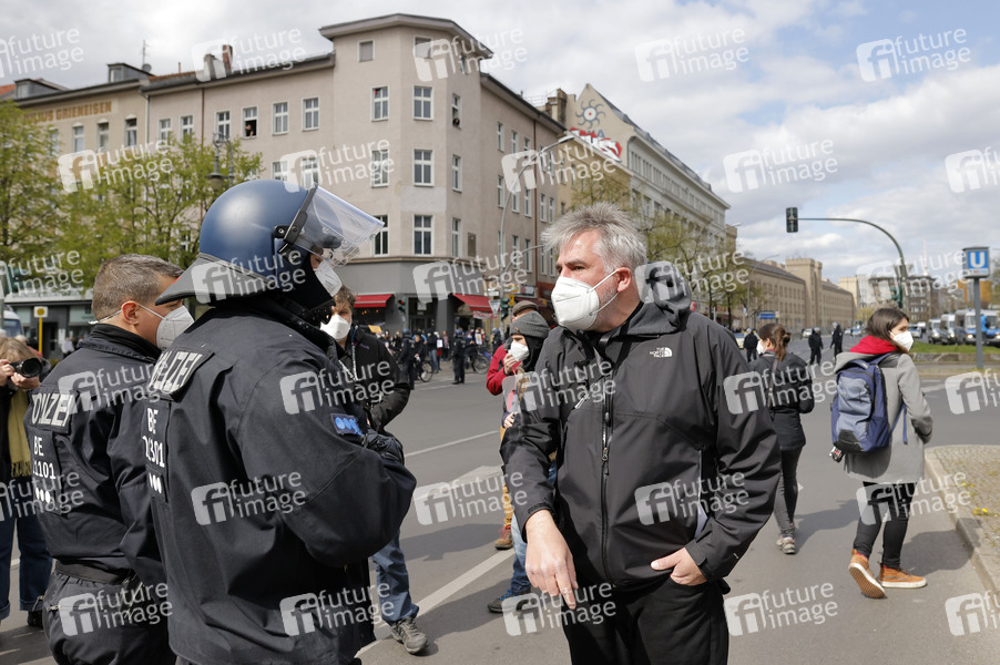 dju-Landesgeschäftsführer Jörg Reichel hat ein Gespräch mit dem Polizeiführer geführt und ihn aufgefordert, mäßigend auf das aggressive Verhalten der Beamten gegen die Presse einzuwirken. Der Polizeiführer bittet um Entschuldigung gegenüber den Journalist*innen. Demonstration in Kreuzberg unter dem Motto 'Generation miteinander - Herzensangelegenheit' aus dem Kreis der Querdenker-Bewegung. Am Rande der Demo kam es zu zahlreichen Gegenprotesten. Berlin, 24.04.2021