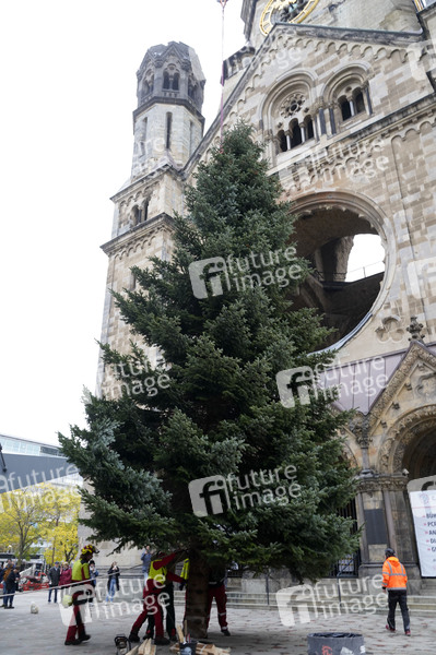 Aufstellung einer 17 Meter hohen Nordmanntanne für den Weihnachtsmarkt auf dem Breitscheidplatz vor der Kaiser-Wilhelm-Gedächtnis-Kirche. Berlin, 02.11.2021