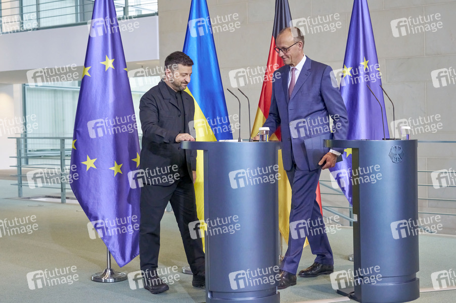 Wolodymyr Selenskyj und Friedrich Merz beim Empfang des Präsidenten der Ukraine mit militärischen Ehren und zu einem gemeinsamen Gespräch mit anschließendem Pressestatement im Bundeskanzleramt. Berlin, 28.05.2025