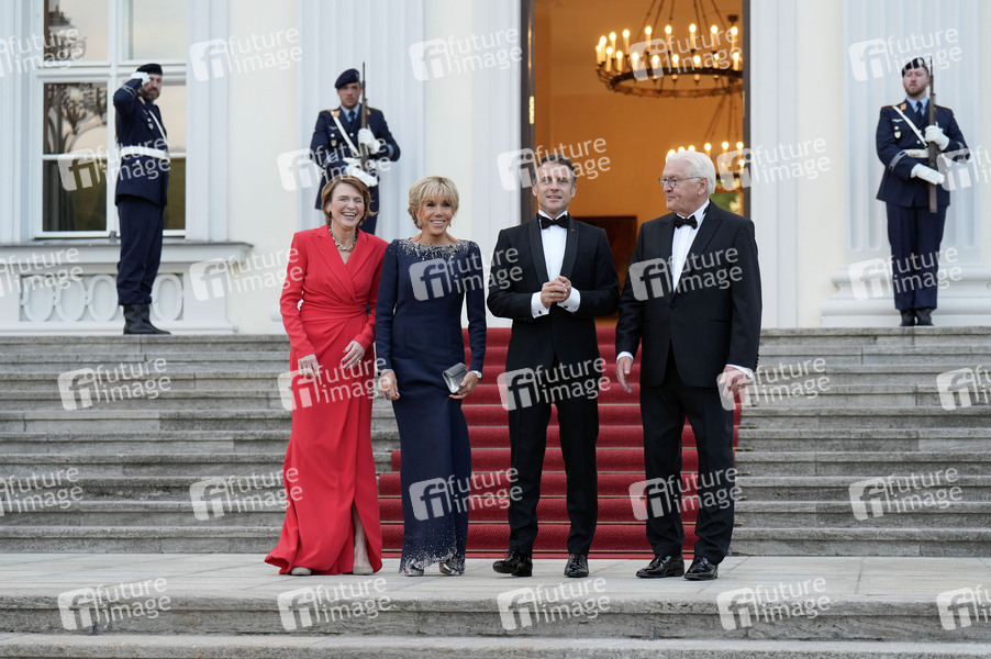 Elke Büdenbender, Brigitte Macron, Emmanuel Macron und Frank-Walter Steinmeier bei der Ankunft zum Staatsbankett zu Ehren des Staatspräsidenten der Französischen Republik im Schloss Bellevue. Berlin, 26.05.2024