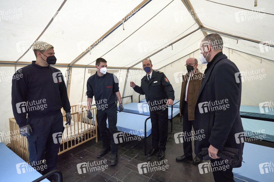 Dieter Rohrberg (Leiter der Feuerwehr Hannover), Volker Kluwe (Polizeipräsident der Polizeidirektion Hannover), Belit Onay (Oberbürgermeister der Landeshauptstadt Hannover) und Mitglieder der Feuerwehr Hannover - Zeltdörfer-Unterkünfte für ukrainische Kriegsflüchtlinge in der Halle 27 auf dem Messegelände, inklusive Wasch- und Duschmöglichkeiten, errichtet von der Feuerwehr Hannover. Die spätere Versorgung erfolgt durch das DRK. Hannover, 06.03.2022
