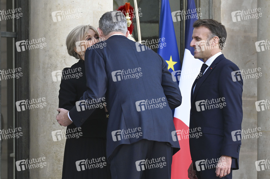 Brigitte Macron, Felipe VI. von Spanien und Emmanuel Macron beim Empfang vom spanischen König zu einem Arbeitsessen im Élysée-Palast. Paris, 13.01.2026