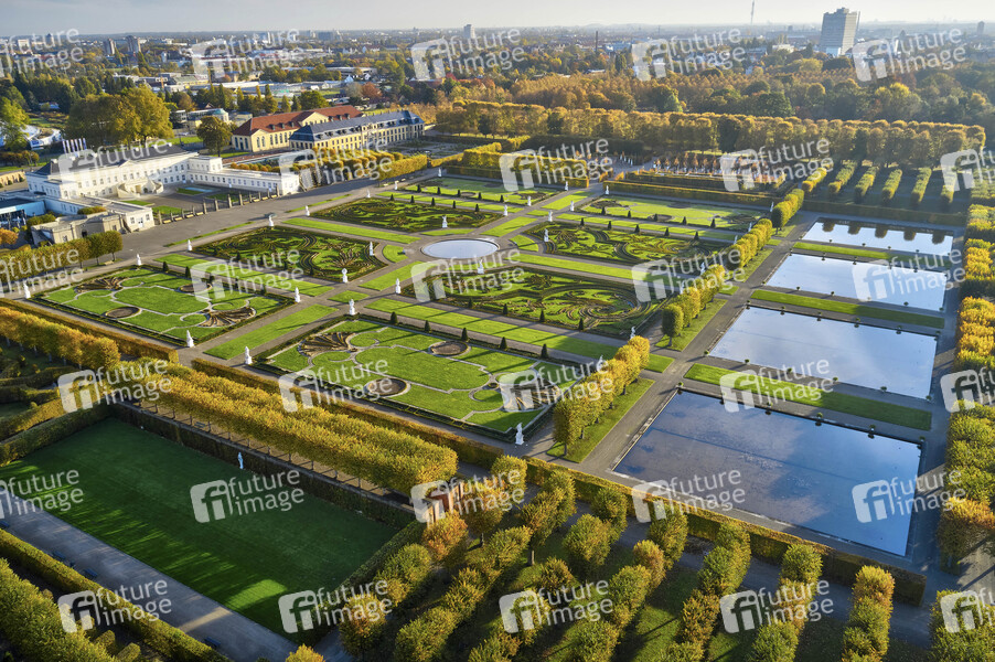 Luftbild der Herrenhäuser Gärten im Herbst (Flug ordnungsgemäß bei der Polizei Hannover-Stöcken angemeldet. Schriftliche Bildfreigabe der Pressestelle der Herrenhäuser Gärten Hannover erteilt durch Frau Anja Kestennus). Hannover, 23.10.2021
