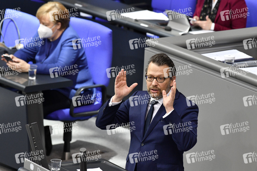 Angela Merkel und Otto Fricke in der 212. Sitzung des Deutschen Bundestages im Reichstagsgebäude. Berlin, 25.02.2021