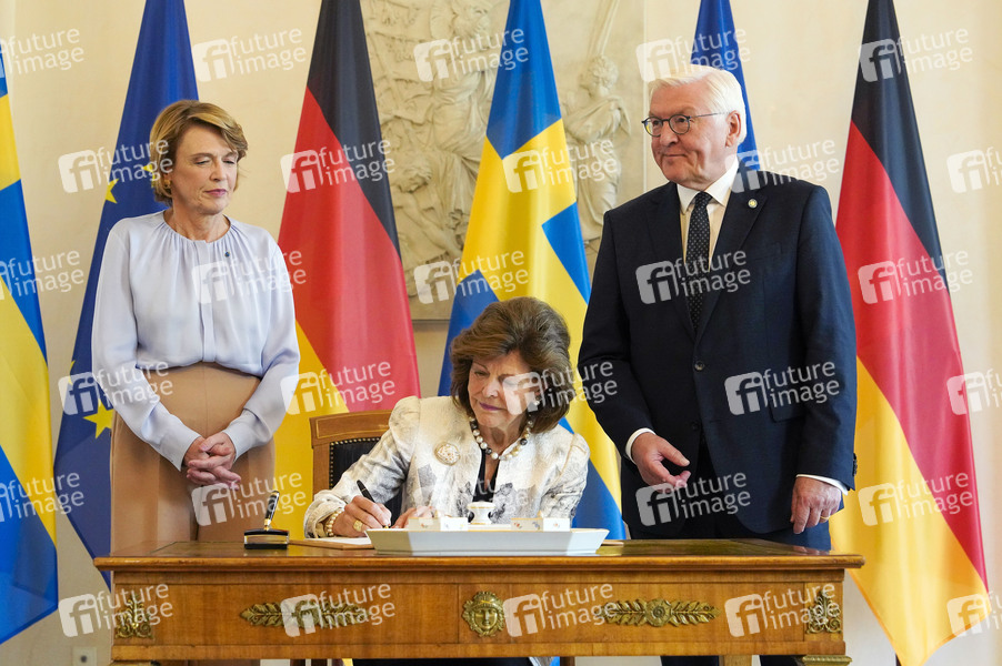 Elke Büdenbender, Königin Silvia von Schweden und Frank-Walter Steinmeier beim Empfang von Königin Silvia von Schweden und Eintrag in das Gästebuch im Schloss Bellevue. Berlin, 18.09.2024