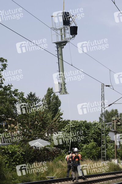 Mitarbeiter bei der Signalinstallation beim Fototermin 'Helikopter fliegt Signalmaste für das neue Elektronische Stellwerk in Bonn-Beuel ein'. Es beginnt letzte große Bauphase vor der Generalsanierung der rechten Rheinstrecke im Jahr 2026. Mit Hilfe eines Helikopters werden knapp 50 Signalmaste für das neue ESTW Bonn-Beuel eingeflogen. Bonn, 14.06.2025