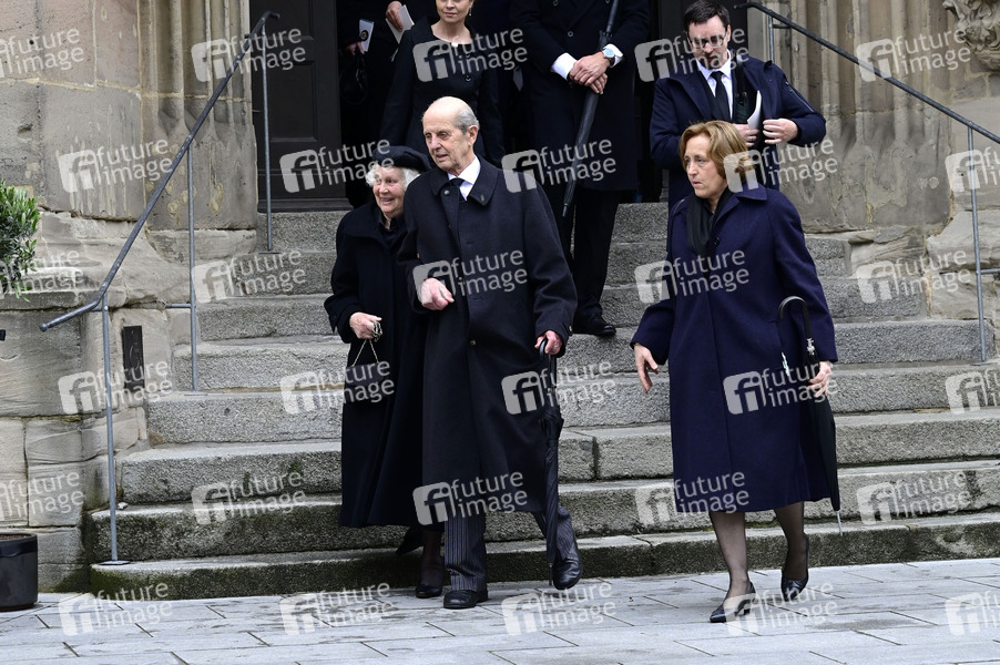 Huno Herzog von Oldenburg und Ehefrau Felicitas-Anita, geb. Gräfin Schwerin von Krosigk und Tochter Beatrix von Storch, geb. Herzogin von Oldenburg, bei der Trauerfeier für Andreas Prinz von Sachsen-Coburg und Gotha in Coburg in der Morizkirche. Coburg, 24.04.2025