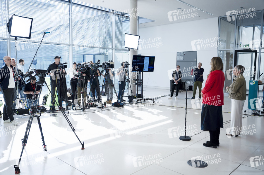Katharina Dröge und Britta Haßelmann bei der Fraktionssitzung der Bündnis 90/Die Grünen-Bundestagsfraktion im Reichstagsgebäude. Berlin, 30.04.2025
