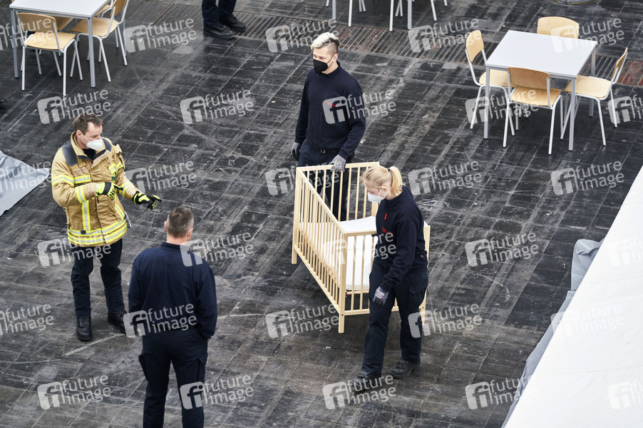 Zeltdörfer-Unterkünfte für ukrainische Kriegsflüchtlinge in der Halle 27 auf dem Messegelände, inklusive Wasch- und Duschmöglichkeiten, errichtet von der Feuerwehr Hannover. Die spätere Versorgung erfolgt durch das DRK. Hannover, 06.03.2022