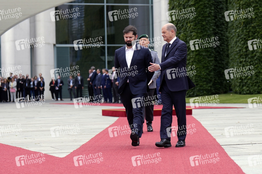 Gabriel Boric und Olaf Scholz beim Empfang des Präsidenten von Chile mit militärischen Ehren und zu einem gemeinsamen Gespräch mit anschließendem Pressestatement im Bundeskanzleramt. Berlin, 10.06.2024