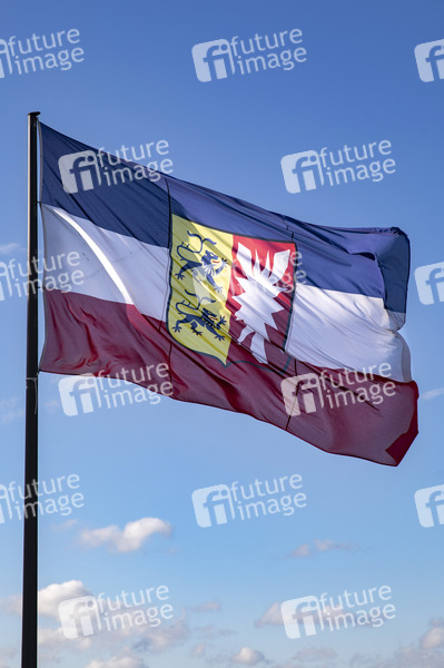 Aluminiummast, Bundesland, Bundesländer, Bundeslandflagge, Bundesrepublik Deutschland, Denkmalflagge, Edelstahlmast, Fahnenmast, Flaggen, Fahne, Kultur, Länderflagge, Landesflagge, Landesvertretung, Mitgliedland, Nationalflagge, Öffentlichkeit, Status, Wappen, Symbolbild, Symbolfoto, Blau, Weiß, Rot, Hoheitszeichen, Herzogtum Schleswig, zwei blaue Löwen, gelber Grund, Herzogtum Holstein, Silbernes Holsteiner Nesselblatt, roter Grund