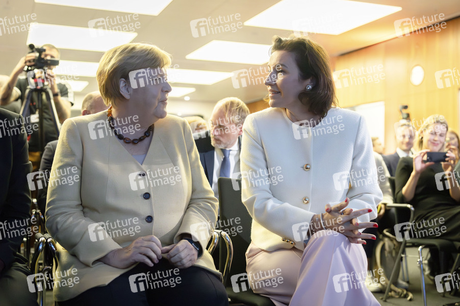Angela Merkel und Dorothee Bär bei der Ausstellungseröffnung 'Unsichtbare Wissenschaftlerinnen - Versäumte Bilder' im Bundesministerium für Forschung, Technologie und Raumfahrt. Berlin, 16.09.2025
