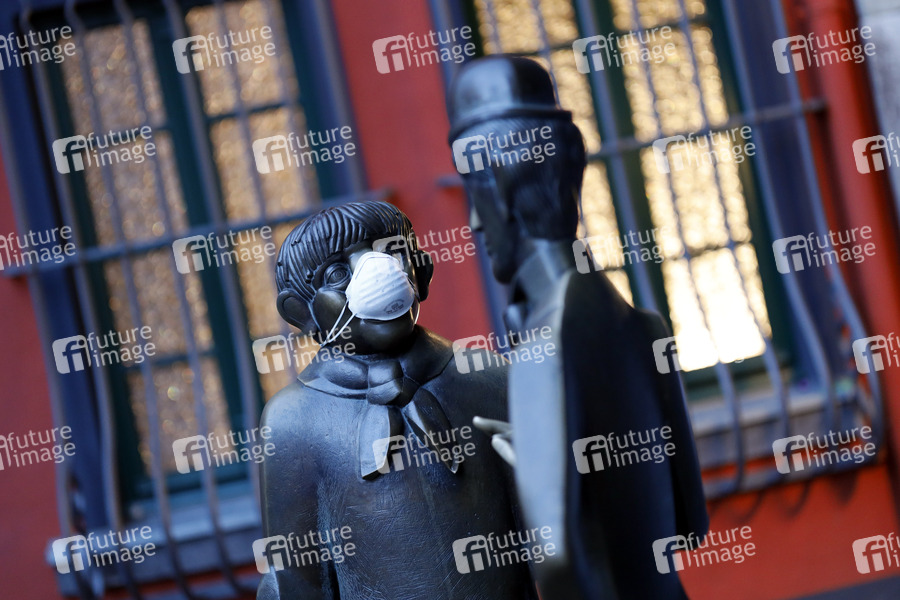Die Figuren von Tünnes und Schäl in der Altstadt tragen Mundschutz während der Corona-Krise. Köln, 20.03.2020