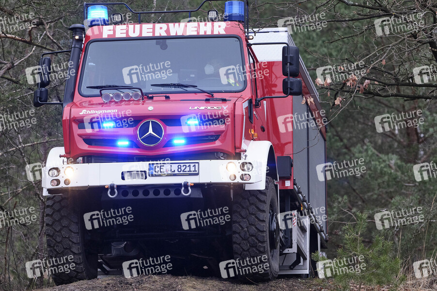 Erprobung eines neuen Waldbrandlöschfahrzeuges von Mercedes Benz Unimog auf dem Truppenübungsplatz des Niedersächsischen Landesamtes für Brand- und Katastrophenschutz und Übergabe an die Feuerwehr Heidekreis Niedersächsisches Landesamt für Brand- und Katastrophenschutz. Celle, 01.03.2021