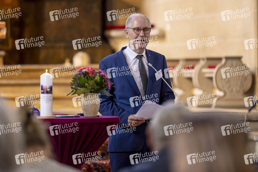 Manfred Müller bei der Eröffnung der Ausstellung 'Udos 10 Gebote' mit 24 Gemälden zu den biblischen 10 Geboten von Udo Lindenberg in der Severikirche. Erfurt, 26.05.2024