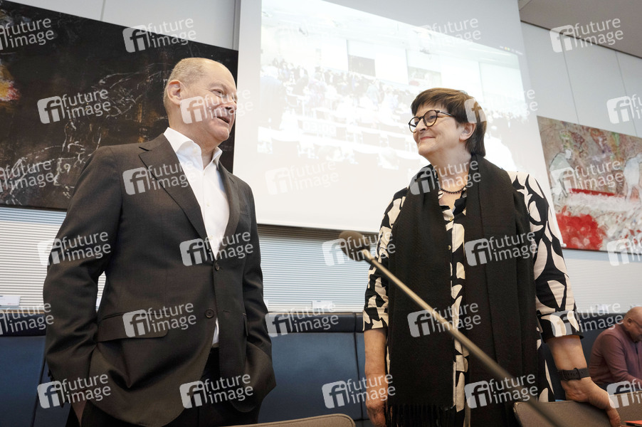 Olaf Scholz und Saskia Esken bei der Fraktionssitzung der SPD-Bundestagsfraktion im Reichstagsgebäude. Berlin, 10.03.2025
