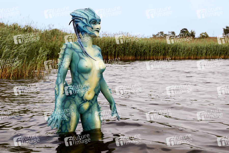 Bodypainting, Body-Painting, Erotik, Frau, Mädchen, nackt, Akt, weiblich, Körperkunst, Körperfarben, Farbe, Bemalung, Kunst, Malerei, Meer, See, Gewässer, Wasser, Monster, Ungeheuer, Fischwesen, Monster aus der Lagune, Schilf, Science Fiction, Sci-Fi, SciFi, Fantastic, Creature from the Black Lagoon, body painting, erotic, woman, girl, nude, female, body art, colors, sea, reed, lake, water, monster, fish being