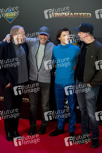 Charles Roven, Alex Gartner, Tom Holland und Ruben Fleischer bei der Premiere des Kinofilms 'Uncharted' im El Hormiguero. Madrid, 08.02.2022