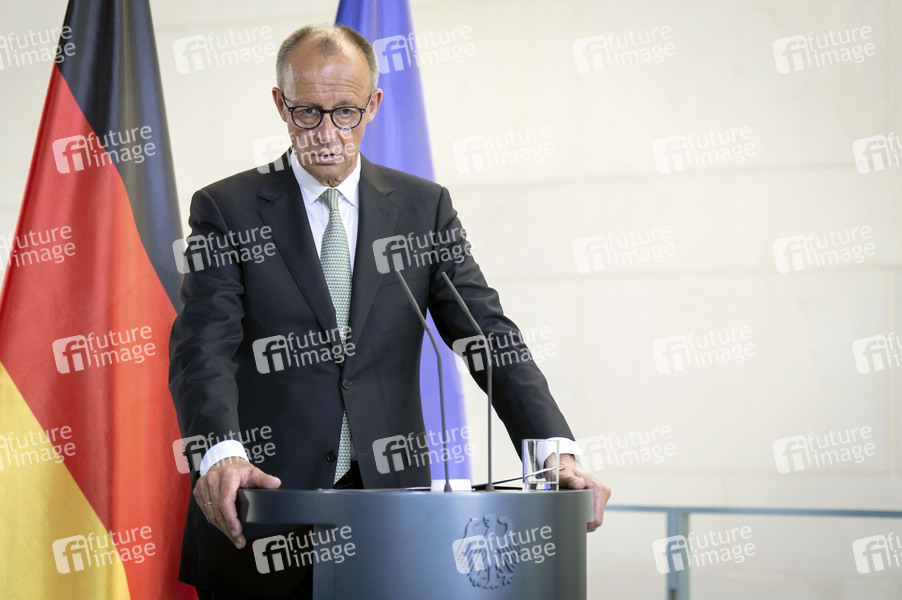 Friedrich Merz beim Empfang des Premierministers von Luxemburg mit militärischen Ehren zu einem gemeinsamen Gespräch mit anschließendem Pressestatement im Bundeskanzleramt. Berlin, 01.07.2025