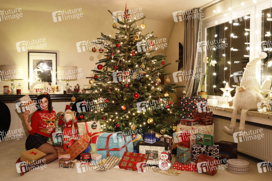 Adventszeit bei Dany Michalski. Exklusives Photoshooting mit Dany Michalski und Model Katey als Bodypainting-Weihnachtspaket unterm Weihnachtsbaum. Einbeck, 06.12.2020 - Bodypainting Künstler: Jörg Düsterwald