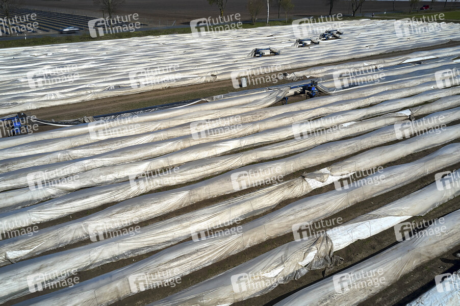 Spargelfeld, Spargel, Spargelfelder, Spargelernte, Gemüse, Erntehelfer, Feld, Luftbild, Luftaufnahme, Engels SpargelSpinne, Spargel Spinne, Spargelmashine