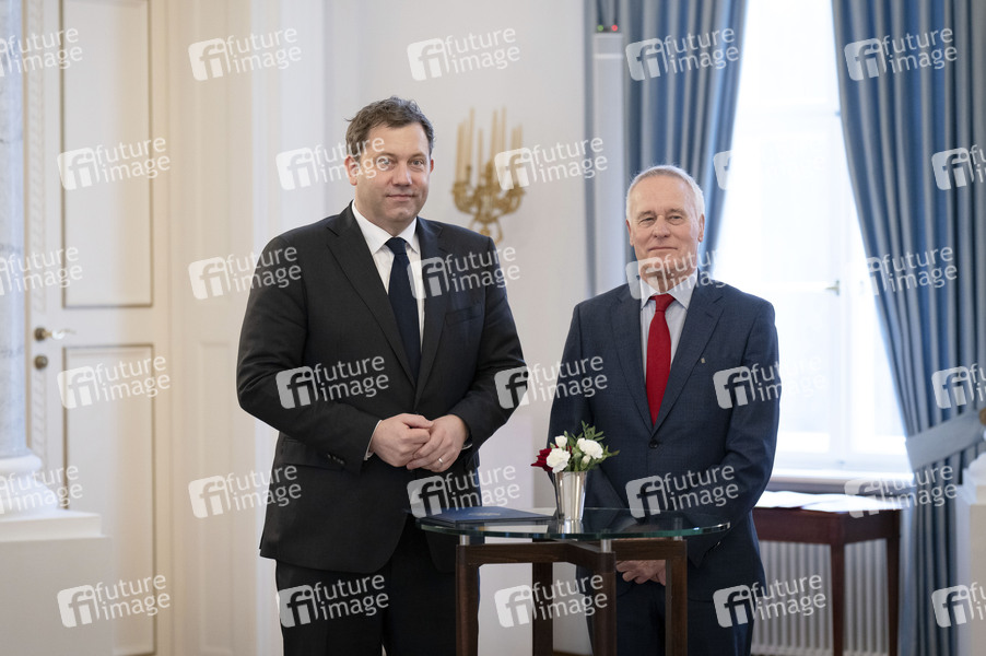 Lars Klingbeil und Achim Meyer auf der Heyde bei der Übergabe der Wohlfahrtsmarken 2026 durch den Bundesminister der Finanzen an den Bundespräsidenten im Schloss Bellevue. Berlin, 12.02.2026