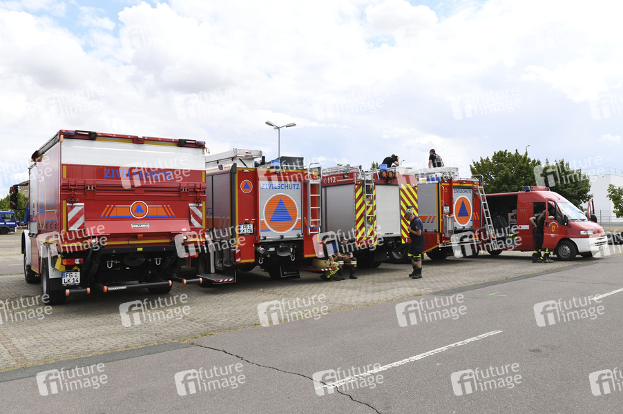 ZIvilschutz-Fahrzeuge beim Pressetermin in der Gohrischheide, wo es seit dem 1. Juli brennt. Derzeit wird von einer vom Brand betroffenen Fläche von etwa 2.100 Hektar ausgegangen. Aktuell befinden sich etwa 600 Kräfte von der Freiwilligen Feuerwehr, dem Technischen Hilfswerk, der Bundeswehr, der Polizei und anderen Organisationen in den fünf Einsatzabschnitten im Einsatz. Im Einsatzabschnitt Jacobsthal ist die Lage stabil. Es gilt weiterhin eine Ausbreitung des Brandgeschehens Richtung Süden zu verhindern sowie den alten Sprengplatz und die Ortschaft zu schützen. Jacobsthal, 07.07.2025