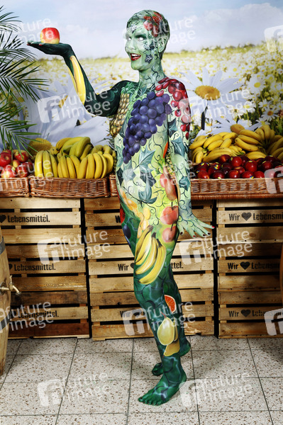 Bodypainting Meets Business, Body-Painting, Erotik, Frau, Mädchen, nackt, Akt, weiblich, Körperkunst, Körperfarben, Farbe, Bemalung, Kunst, Malerei, Fotografie, Beruf, Obst, Früchte, gesund, Ernährung, Apfel, Banane, Ananas, Melone, Joerg Dewaldo Duesterwald, body painting, erotic, woman, girl, nude, female, body art, colors, photography, profession, fruit, fruits, healthy, nutrition, apple, banana, pineapple, melon