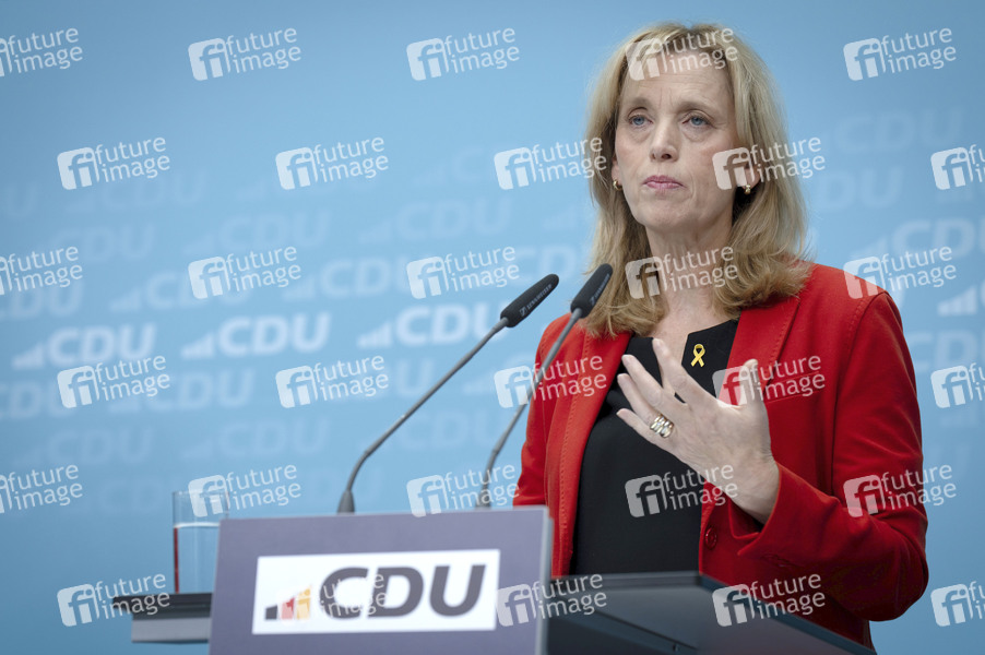 Karin Prien bei der Pressekonferenz der CDU im Anschluss an die Gremiensitzungen im Konrad-Adenauer-Haus. Berlin, 06.10.2025