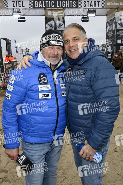 Till Demtroeder und Karsten Speck beim 9. Baltic Lights 2025 Charity-Schlittenhunderennen zu Gunsten der Welthungerhilfe zwischen der Seebrücke Ahlbeck und der Seebrücke Heringsdorf. Heringsdorf, 01.03.2025