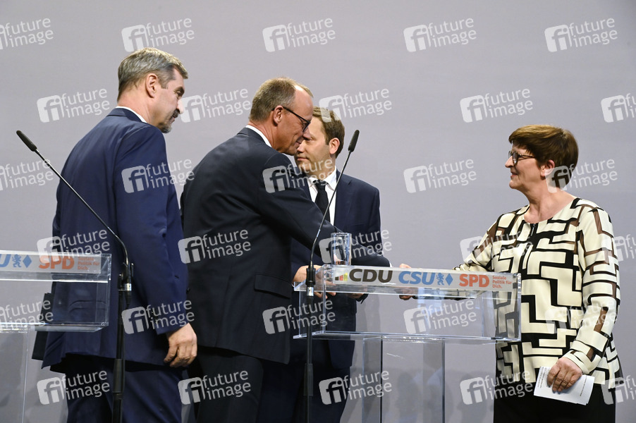 Markus Söder, Friedrich Merz, Lars Klingbeil und Saskia Esken bei der Pressekonferenz von CDU, CSU und SPD zur Vorstellung des gemeinsamen Koalitionsvertrages im Paul-Löbe-Haus. Berlin, 09.04.2025