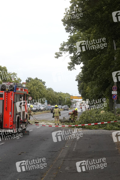 Am Eingang des Willy Sänger Sportplatz wurde durch eine Sturmböhe eine alte Eiche auf die Fahrbahn der Köpenicker Landstraße gelegt. Die Berliner Feuerwehr beseitigt den Baum. Berlin, 23.06.2025