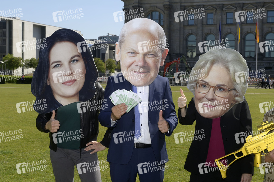 Aktivisten bei einer Protestaktion gegen das sogenannte Sondervermögen von 100 Milliarden für die Bundeswehr vor dem Reichstagsgebäude. Berlin, 03.06.2022