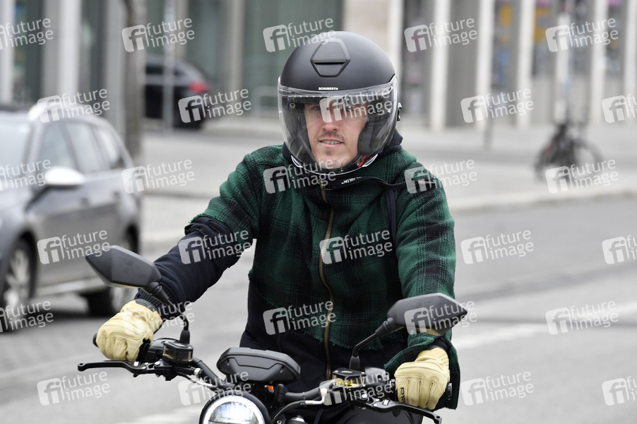 Max Kruse beim Fototermin zur Eröffnung der Zweiradsaison 2021 mit eROCKIT an der East Side Gallery. Berlin, 11.03.2021