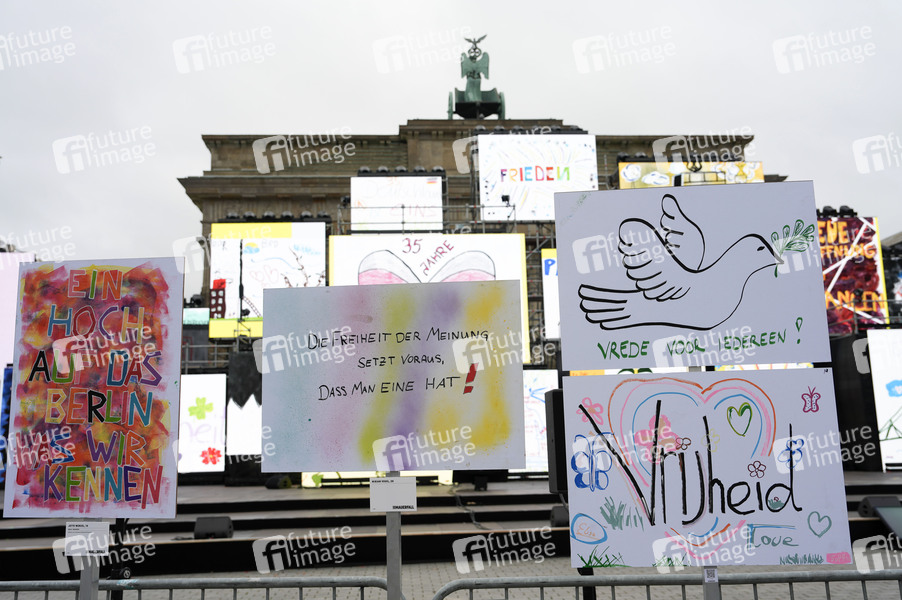 Plakate mit dem Motto 'Haltet die Freiheit hoch!' entlang des vier Kilometer langen ehemaligen Mauerverlaufs als Open-Air-Installation aus Anlass des 35. Jahrestags der friedlichenen Revolution und des Mauerfalls. Berlin, 08.11.2024