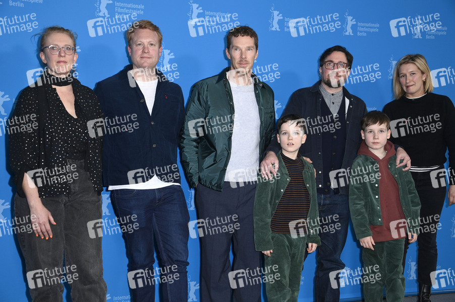 Andrea Cornwell, Adam Ackland, Benedict Cumberbatch, Richard Boxall, Dylan Southern, Henry Boxall und Leah Clarke beim Photocall zum Kinofilm 'The Thing with Feathers' auf der Berlinale 2025 / 75. Internationale Filmfestspiele Berlin im Hotel Grand Hyatt. Berlin, 18.02.2025