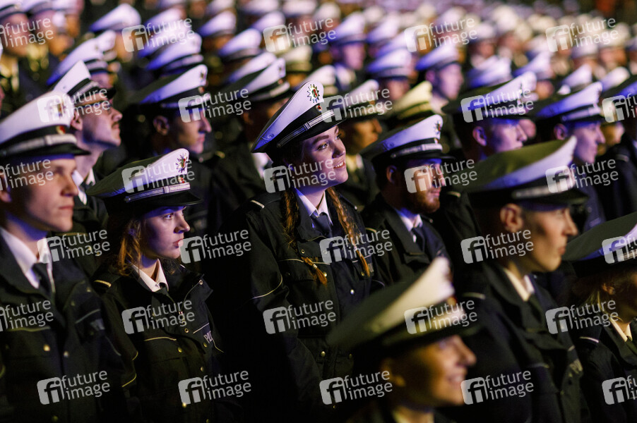Vereidigung von neuen Kommissaranwärterinnen und Kommissaranwärtern samt traditionellem Mützenwurf in der Lanxess-Arena. Köln, 03.04.2019