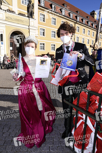 Das Prinzenpaar Berni I. (Berni Filser) und Margarethe I. (Margarethe Stadlbauer) bei der Aktion 'Fasching 2021 im Tascherl' vor dem Haus St. Josef (Münchenstift-Einrichtung). Um älteren Menschen, die in Zeiten der Pandemie besonders unter den Kontaktbeschränkungen leiden, ein bisschen Faschingsfreude ins Leben zu bringen, spenden der Verein 'Münchner für Münchner e.V.', die Josef und Luise Kraft-Stiftung und die Münchner Faschingsgesellschaft Narrhalla 3000 bunte Faschingstaschen für Münchner Senior*innen-Einrichtungen. München, 04.02.2021